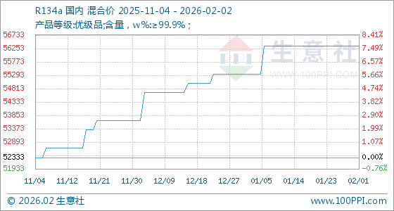 2月2日,生意社R134a基准价为56333.33元/吨,与本月初持平。