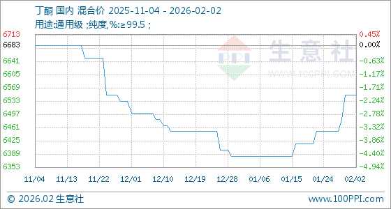 2月2日,生意社丁酮基准价为6550.00元/吨,与本月初持平。