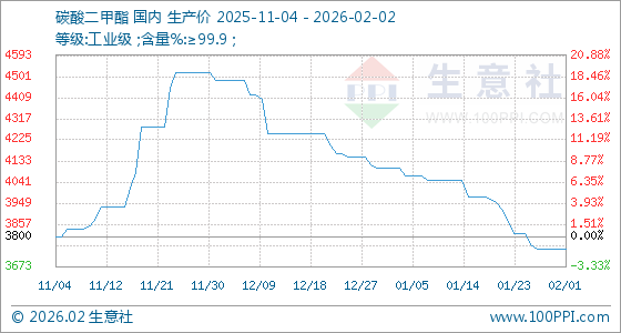 2月2日,生意社碳酸二甲酯基准价为3750.00元/吨,与本月初持平。