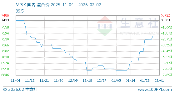 2月2日,生意社MIBK基准价为7266.67元/吨,与本月初持平。