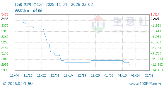 2月2日,生意社片碱基准价为2983.33元/吨,与本月初持平。