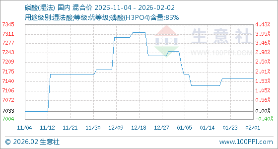 2月2日,生意社磷酸(湿法)基准价为7150.00元/吨,与本月初持平。
