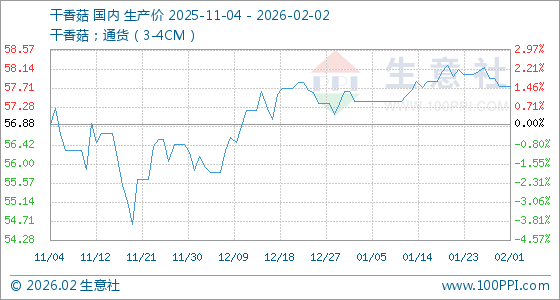 2月2日,生意社干香菇基准价为57.74元/公斤,与本月初持平。