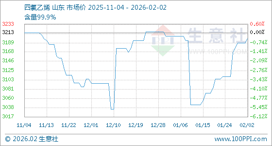 2月2日,生意社四氯乙烯基准价为3188.89元/吨,与本月初持平。