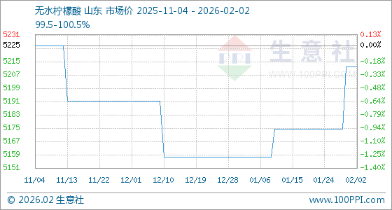 2月2日,生意社无水柠檬酸基准价为5212.50元/吨,与本月初持平。