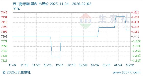 2月2日,生意社丙二醇甲醚基准价为7400.00元/吨,与本月初持平。