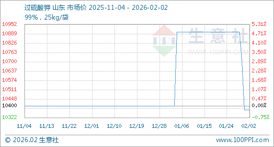 2月2日,生意社过硫酸钾基准价为10800.00元/吨,与本月初持平。