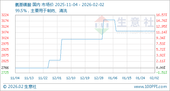 2月2日,生意社氨基磺酸基准价为3087.50元/吨,与本月初持平。