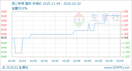 2月2日,生意社间二甲苯基准价为9333.33元/吨,与本月初持平。