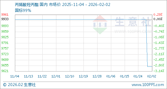 2月2日,生意社丙烯酸羟丙酯基准价为9650.00元/吨,与本月初持平。