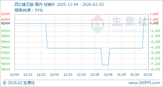 2月2日,生意社四乙烯五胺基准价为61500.00元/吨,与本月初持平。