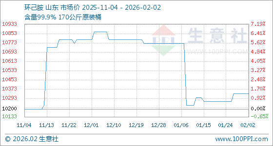 2月2日,生意社环己胺基准价为10333.33元/吨,与本月初持平。
