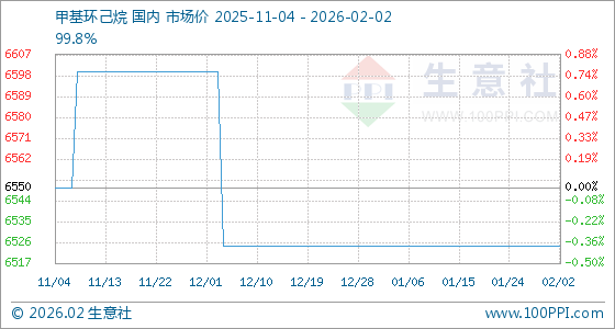 2月2日,生意社甲基环己烷基准价为6525.00元/吨,与本月初持平。