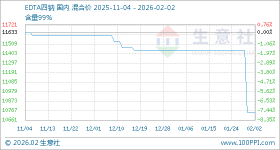 2月2日,生意社EDTA四钠基准价为10750.00元/吨,与本月初持平。