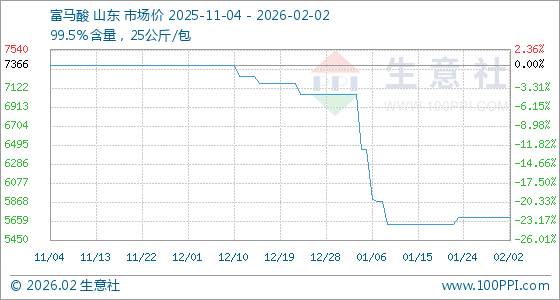 2月2日,生意社富马酸基准价为5700.00元/吨,与本月初持平。