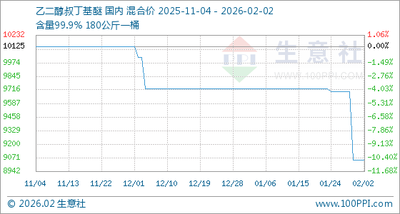 2月2日,生意社乙二醇叔丁基醚基准价为9050.00元/吨,与本月初持平。