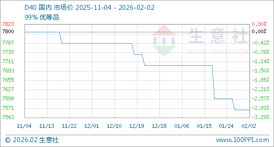 2月2日,生意社D40基准价为7566.67元/吨,与本月初持平。