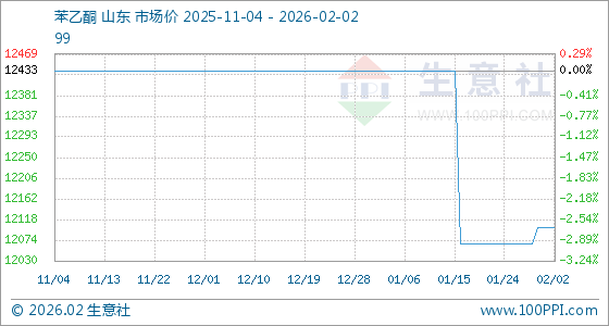 2月2日,生意社苯乙酮基准价为12100.00元/吨,与本月初持平。