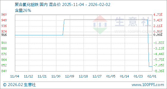 2月2日,生意社聚合氯化铝铁基准价为850.00元/吨,与本月初持平。