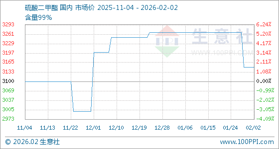 2月2日,生意社硫酸二甲酯基准价为3150.00元/吨,与本月初持平。