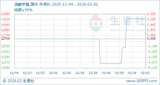 2月2日,生意社油酸甲酯基准价为13150.00元/吨,与本月初持平。