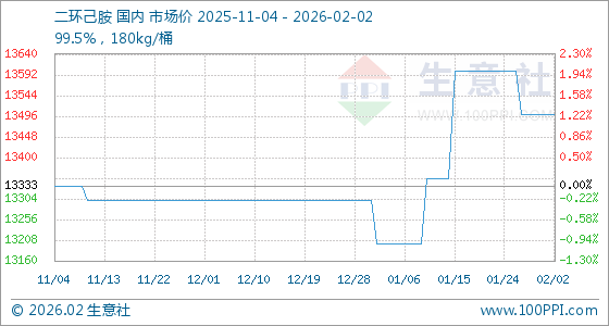 2月2日,生意社二环己胺基准价为13500.00元/吨,与本月初持平。