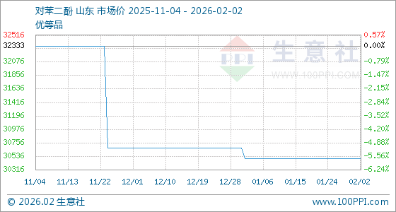2月2日,生意社对苯二酚基准价为30500.00元/吨,与本月初持平。