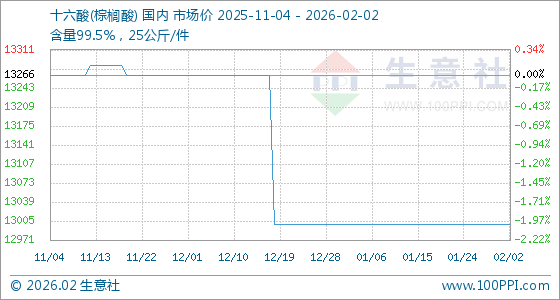 2月2日,生意社十六酸(棕榈酸)基准价为13000.00元/吨,与本月初持平。