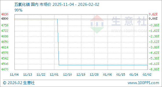 2月2日,生意社五氯化磷基准价为4500.00元/吨,与本月初持平。