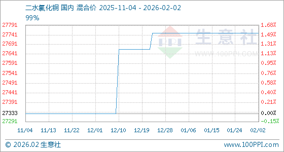 2月2日,生意社二水氯化铜基准价为27750.00元/吨,与本月初持平。