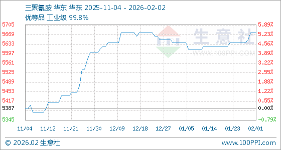 2月2日,生意社三聚氰胺基准价为5675.00元/吨,与本月初持平。