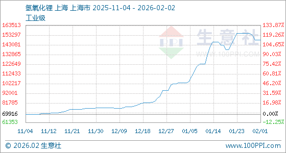 2月2日,生意社氢氧化锂(工业级)基准价为148000.00元/吨,与本月初持平。