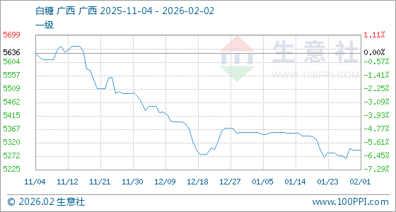 2月2日,生意社白糖基准价为5295.00元/吨,与本月初持平。