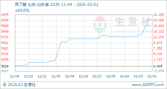 2月2日,生意社异丁醛基准价为6106.67元/吨,与本月初持平。