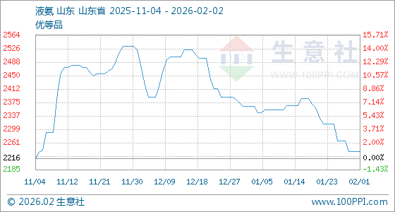 2月2日,生意社液氨基准价为2236.67元/吨,与本月初持平。