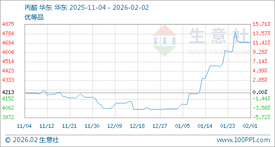 2月2日,生意社丙酮基准价为4700.00元/吨,与本月初持平。