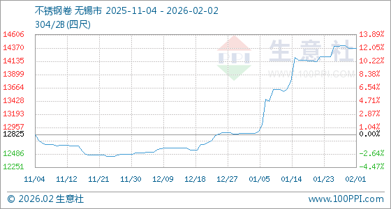 2月2日,生意社不锈钢卷基准价为14360.00元/吨,与本月初持平。