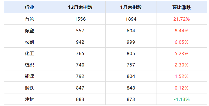 生意社监测的8个行业,当月涨多跌少,上涨前三的分别是有色行业,涨幅为21.72%,橡塑行业,涨幅为8.44%,农副行业,涨幅为6.05%;下跌的是建材行业,跌幅为-1.13%。