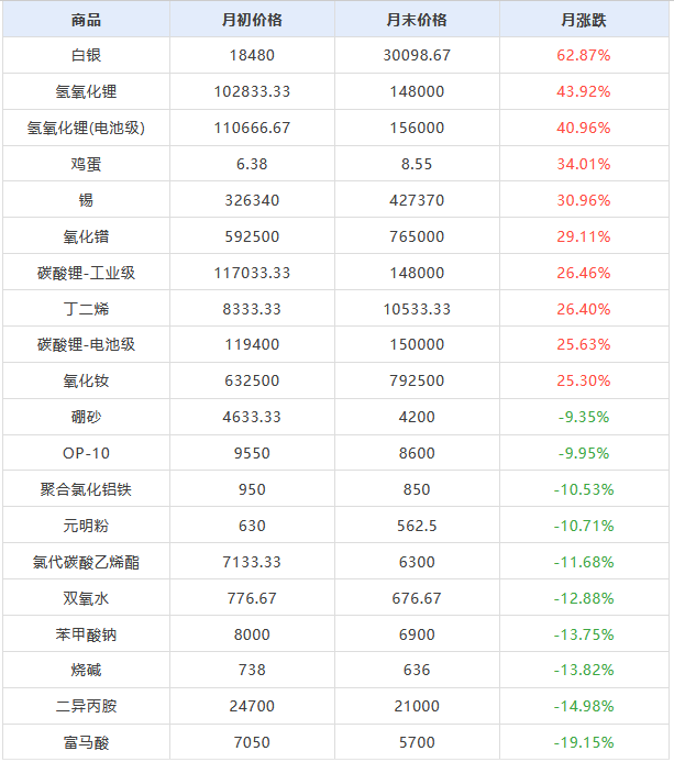 备注:白银为元/千克,鸡蛋为元/公斤,其余元/吨。