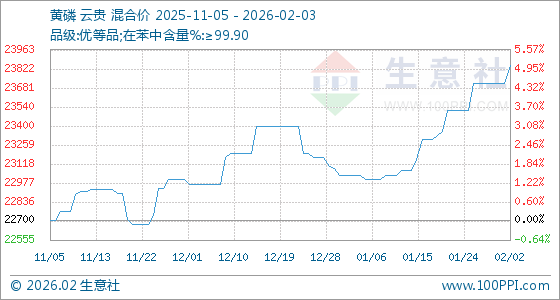 2月3日,生意社黄磷基准价为23846.00元/吨,与本月初(23712.67元/吨)相比,上涨了0.56%。