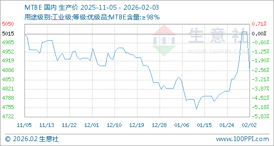 2月3日,生意社MTBE基准价为4883.33元/吨,与本月初(5023.33元/吨)相比,下降了2.79%。