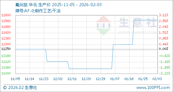 2月3日,生意社氟化铝基准价为11550.00元/吨,与本月初持平。