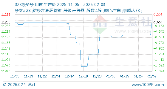 2月3日,生意社32S涤纶纱基准价为11266.67元/吨,与本月初(11200.00元/吨)相比,上涨了0.60%。