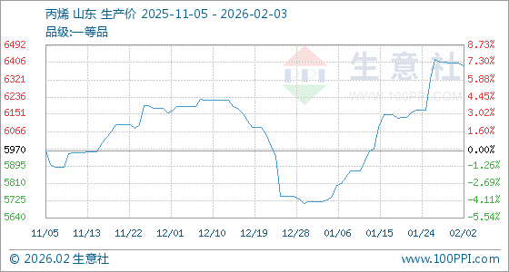 2月3日,生意社丙烯基准价为6391.00元/吨,与本月初(6404.33元/吨)相比,下降了0.21%。