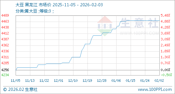 2月3日,生意社大豆基准价为4468.00元/吨,与本月初持平。