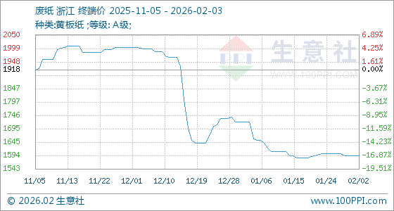 2月3日,生意社废纸基准价为1592.00元/吨,与本月初持平。