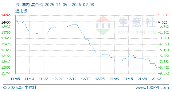 2月3日,生意社PC基准价为12833.33元/吨,与本月初(12966.67元/吨)相比,下降了1.03%。