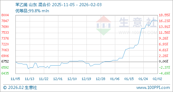 2月3日,生意社苯乙烯基准价为7840.00元/吨,与本月初(7874.00元/吨)相比,下降了0.43%。