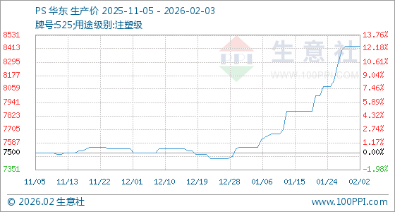2月3日,生意社PS基准价为8433.33元/吨,与本月初持平。
