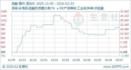 2月3日,生意社硫酸基准价为965.00元/吨,与本月初持平。